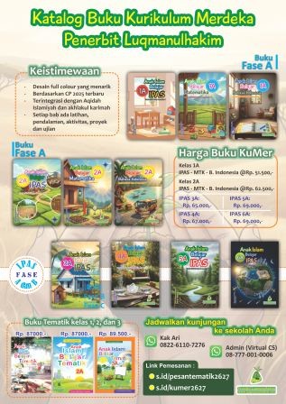 *Harga Hubungi 087770010006Buku Kurikulum Merdeka Fase A (Kelas 1 dan 2 SD) Matematika, Bahasa Indonesia dan IPAS Buku kurikulum merdeka terbaru untuk sekolah dasar islam fase a meliputi mata pelajaran IPAS (mandiri), Matematika dan Bahasa Indonesia. Setiap semester memuat 4 bab dan masing-masing bab memuat 2 sub-bab untuk memastikan materi, latihan, aktivitas, proyek, dan assesmen bisa dijalankan… selengkapnya